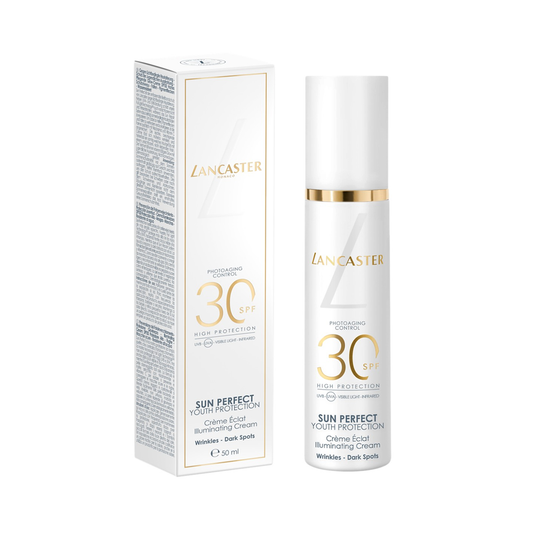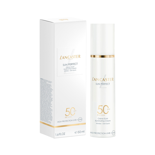 Reversing the visible signs of aging caused by photoaging, Lancaster Sun Perfect Illuminating Cream SPF50...