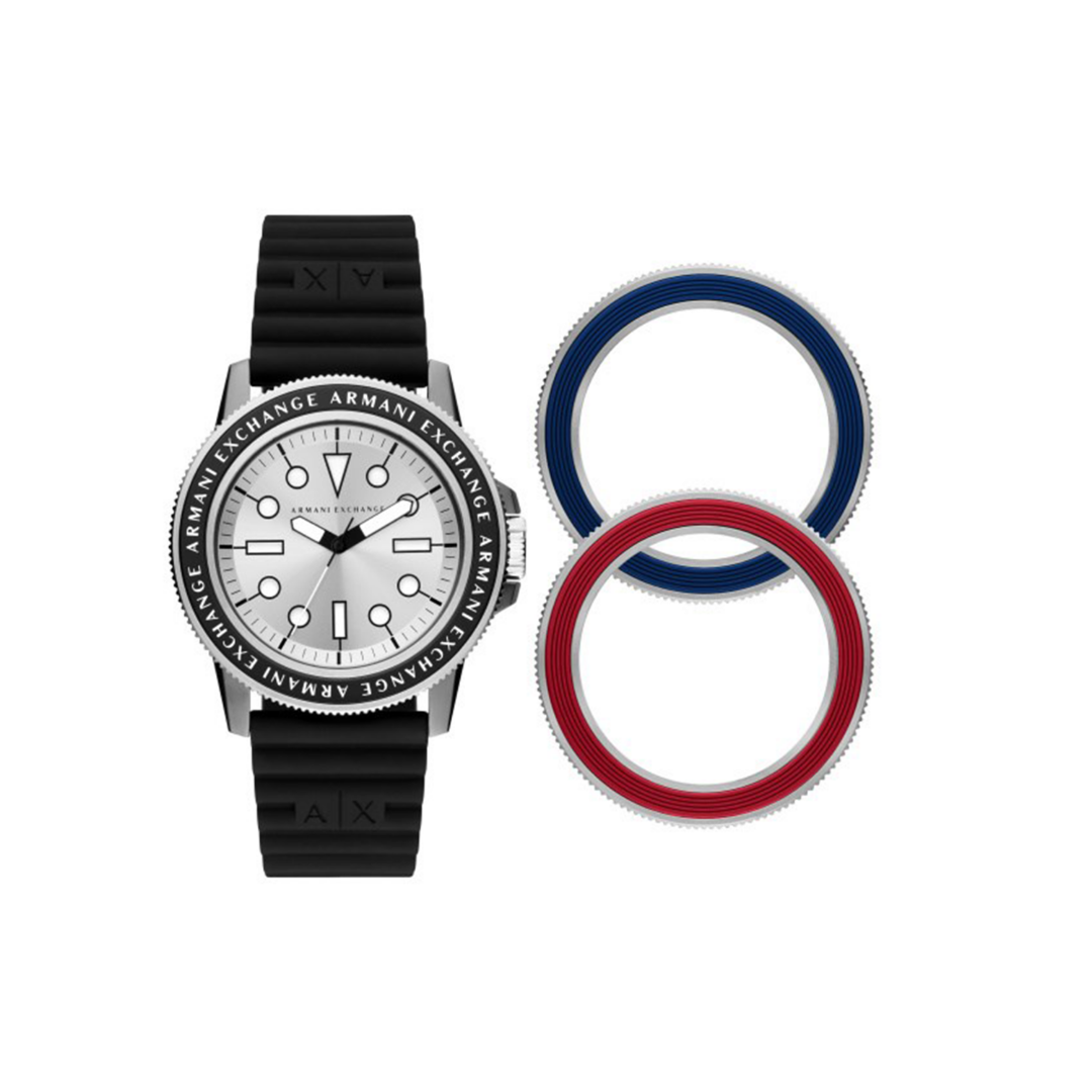 AX7136SET, Band Color: Silicon Black, Dial Color: Silver, Case Diameter: 42MM, Watch movement Type: Quartz Set: 2 Different Bezels