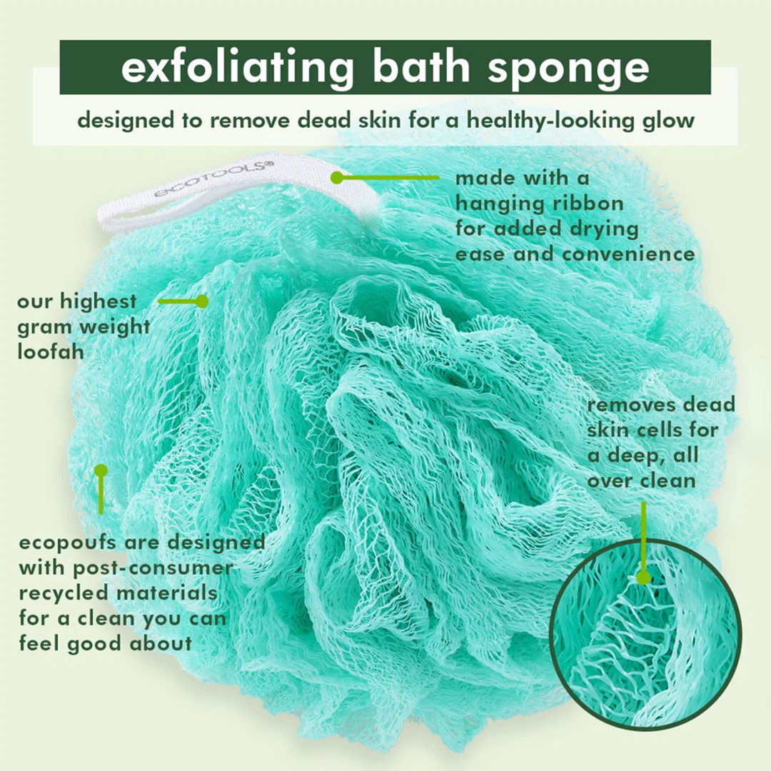 The EcoTools Exfoliating EcoPouf® is designed with exfoliating textured recycled netting to remove dead skin cells for a deep, all-over clean. Made with fine netting for a thorough exfoliation as it removes dead skin, and leaves freshly even skin. Leaving skin supple and soft the Exfoliating EcoPouf® is a bath time staple.