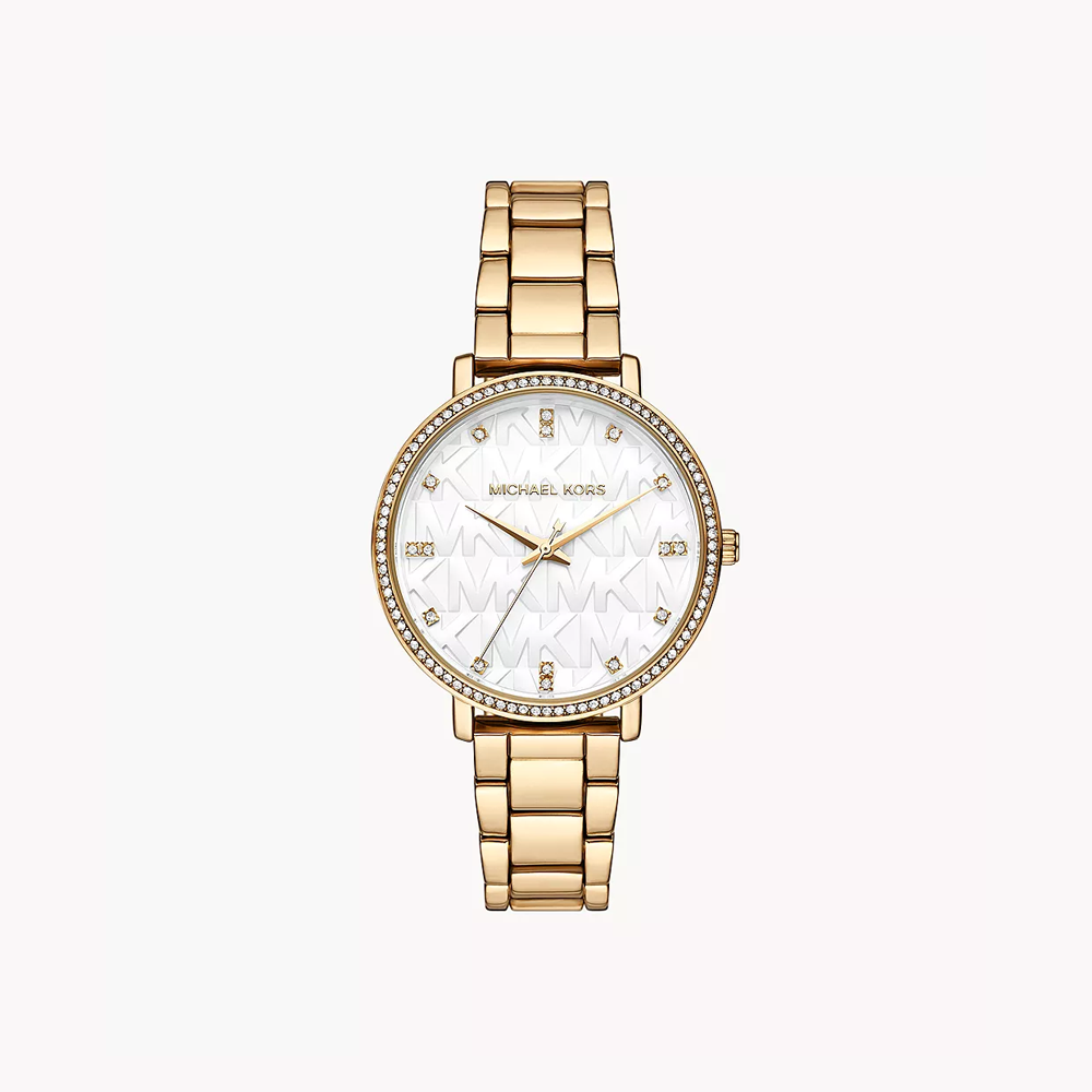 Elevate your everyday with the Michael Kors Pyper watch. Its sunray white dial pops against a gold-tone alloy case and bracelet. Wear it day to night—this timepiece effortlessly complements any look.