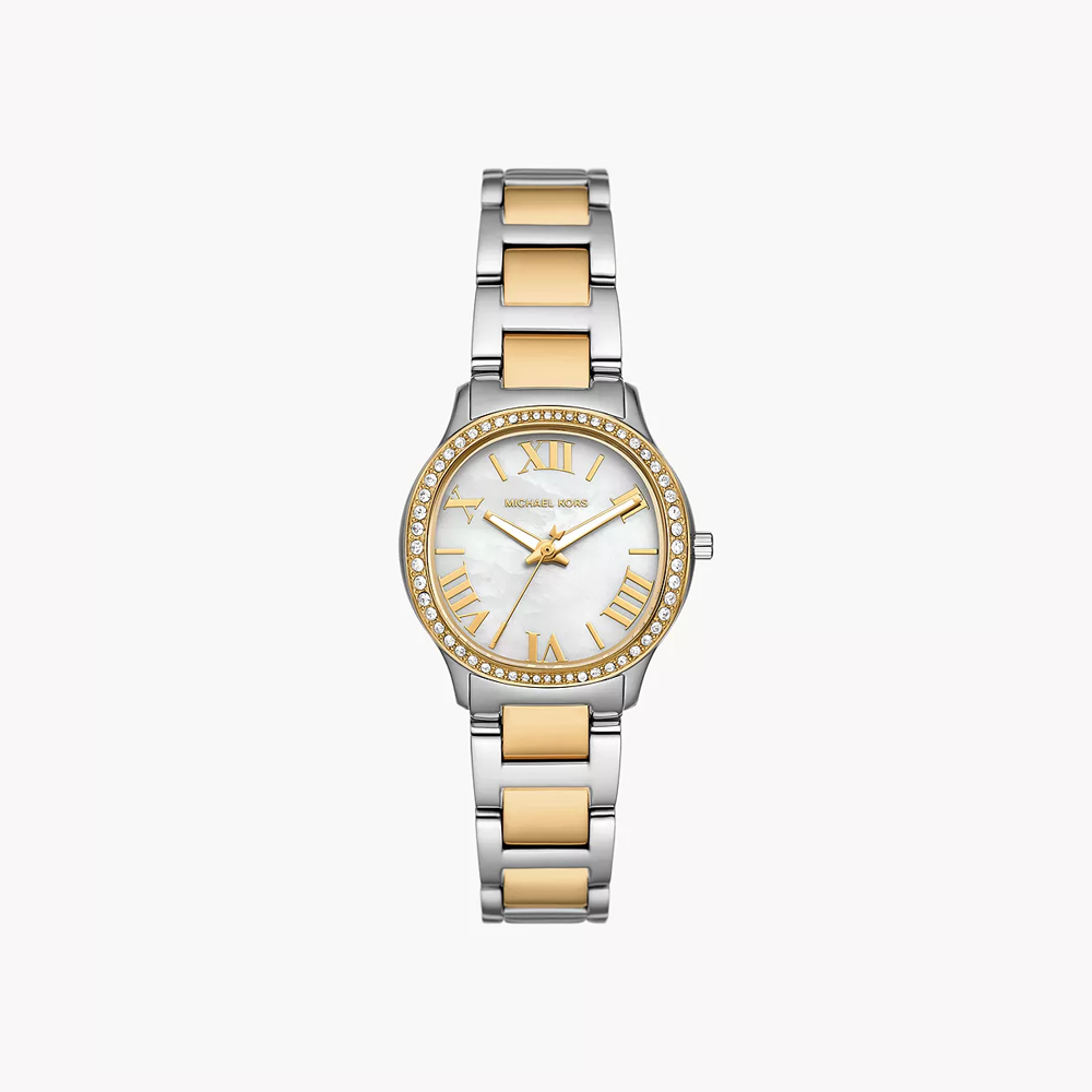 Designed with an iridescent mother-of-pearl face illuminated by glittering pavé accents around the top ring, this shrunken-down version of our coveted Sage watch is timeless. Crafted from two-tone stainless steel, it features Roman numeral indexes for precise timekeeping and a dainty casebody that makes it easy to stack with complementing bracelets.