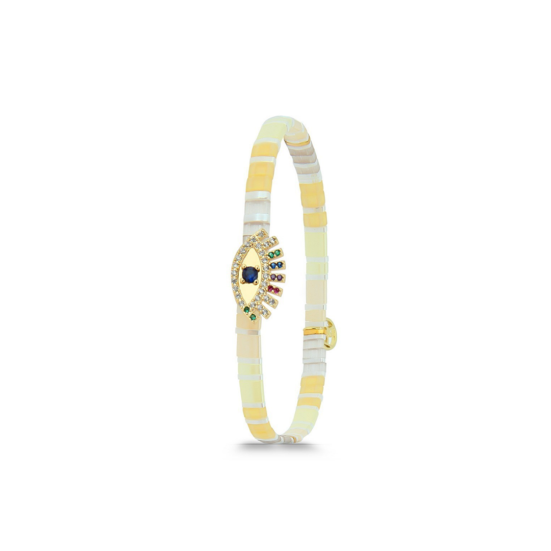 Polo Exchange Tila Beads Stretch Bracelet Mix White With Yellow Gold Plating Eye With Stones.