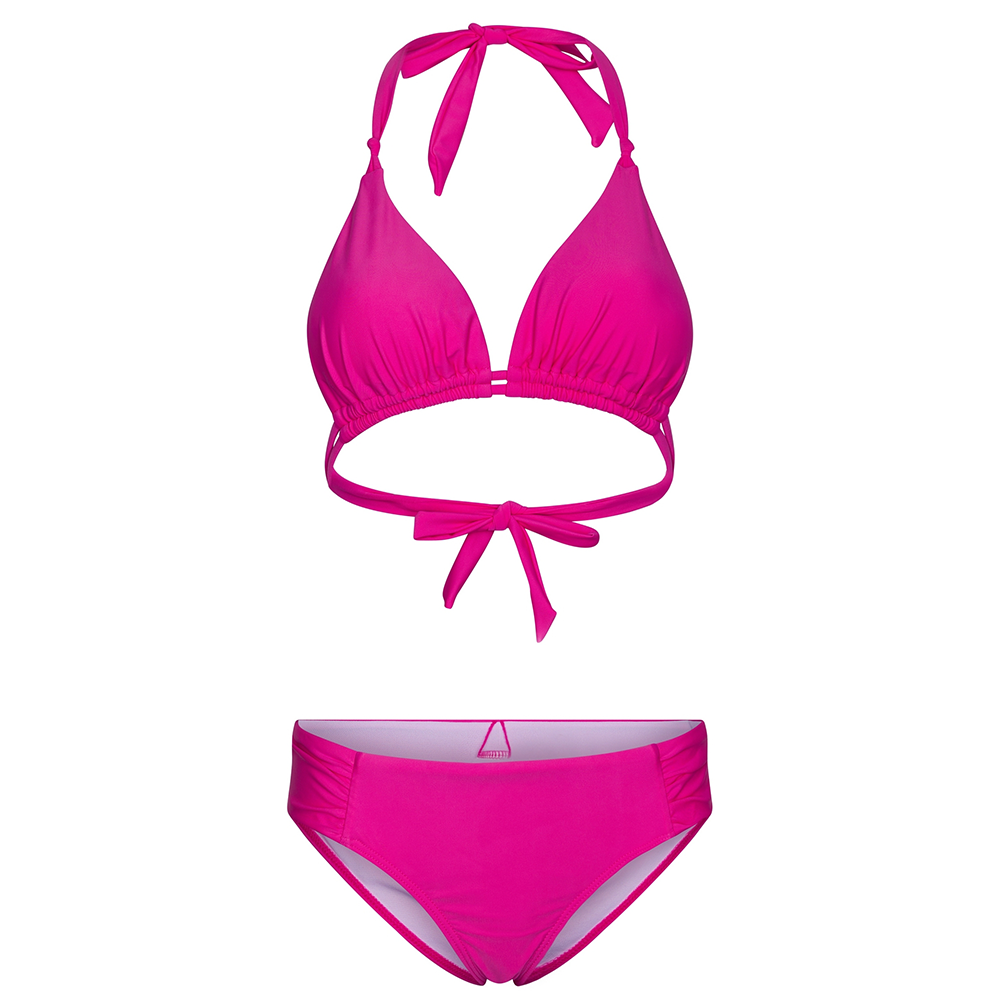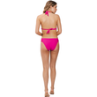 A triangle bikini top with neck and back ties, both adjustable. With a slightly gathered bust, it can also slide for more or less coverage. Designed in a vibrant cerise pink, style with the matching Bebe Bikini Bottom for your summer vacation wear.